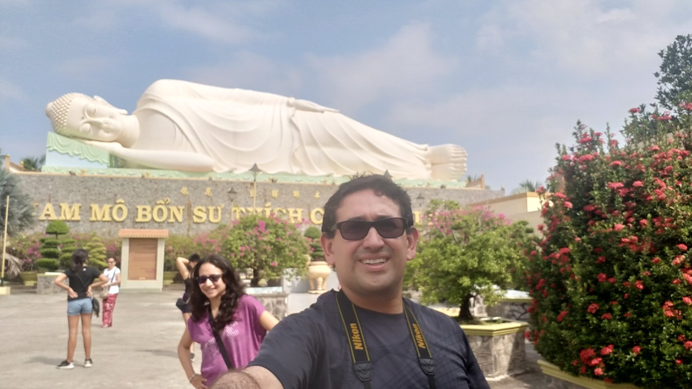 Finalmente llegamos al hotel, y nuestras redes sociales se activaron. Recibimos un mensaje de una amigo Mr Lê. Él es un monje y quiere enseñarnos algo de meditacion. Estamos algo cansados; sin embargo, recibimos su visita.