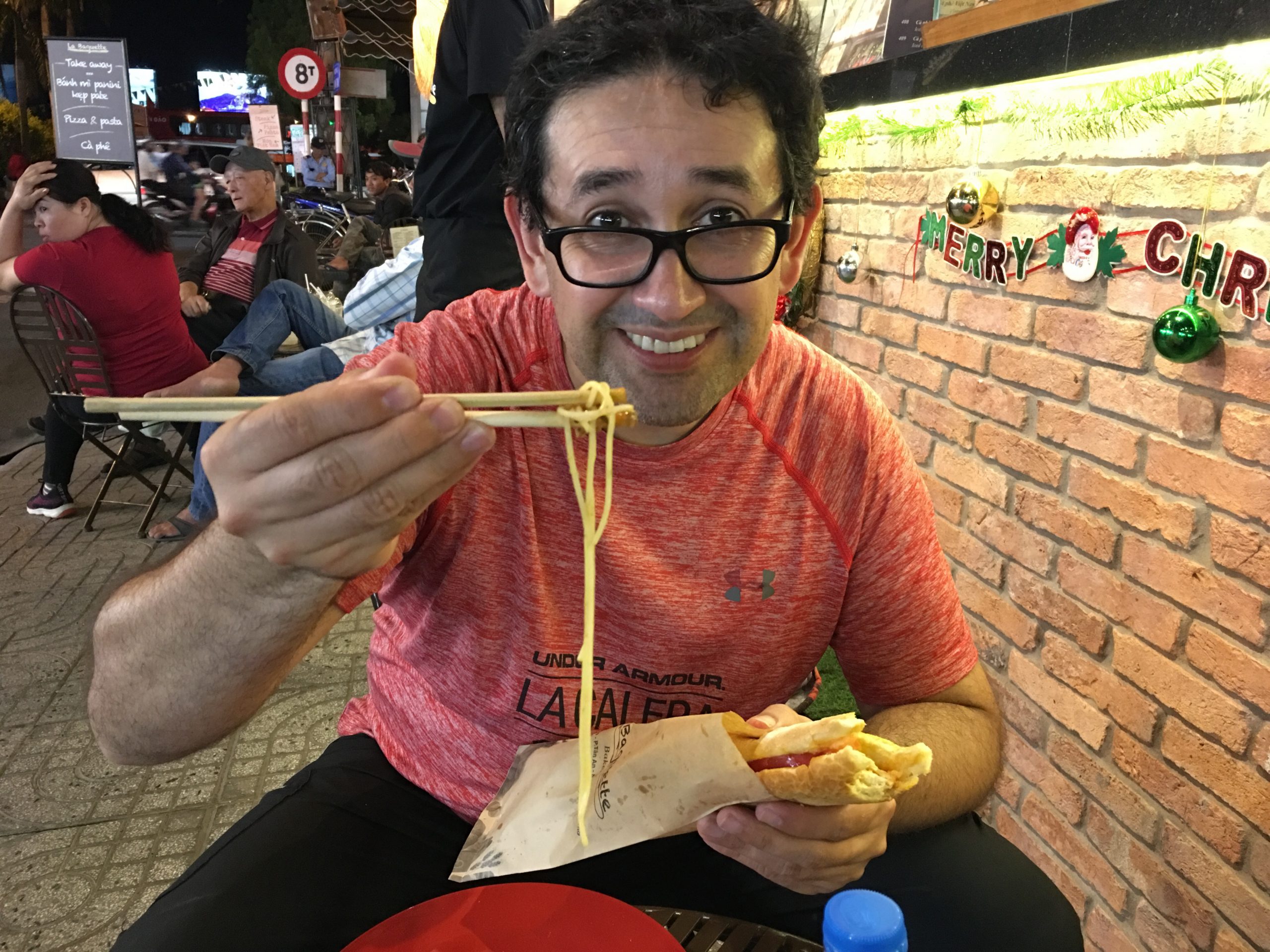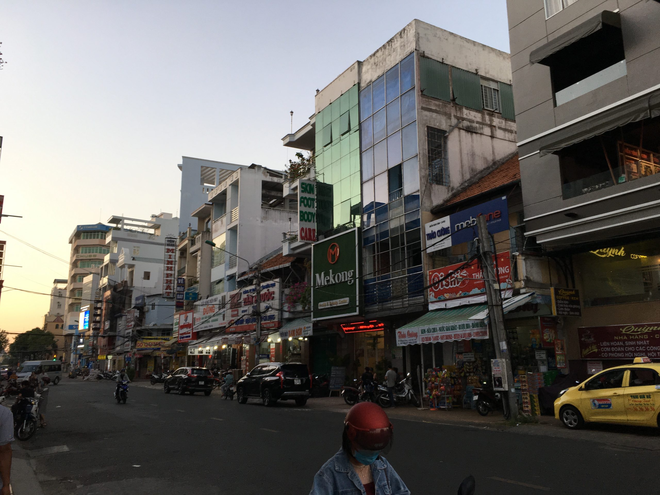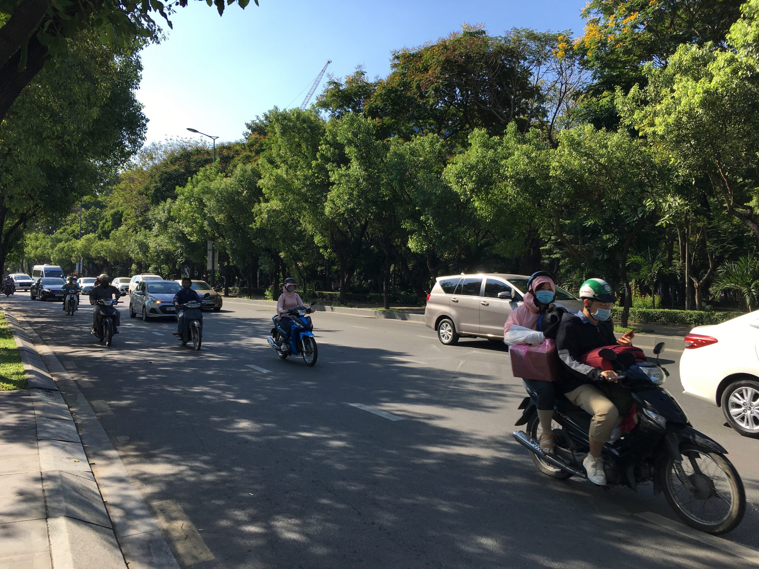 There was a bus stop ahead but we were afraid to cross the street without traffic jam (Some part of HCM city does not have traffic light so people have to manage how to cross the street.